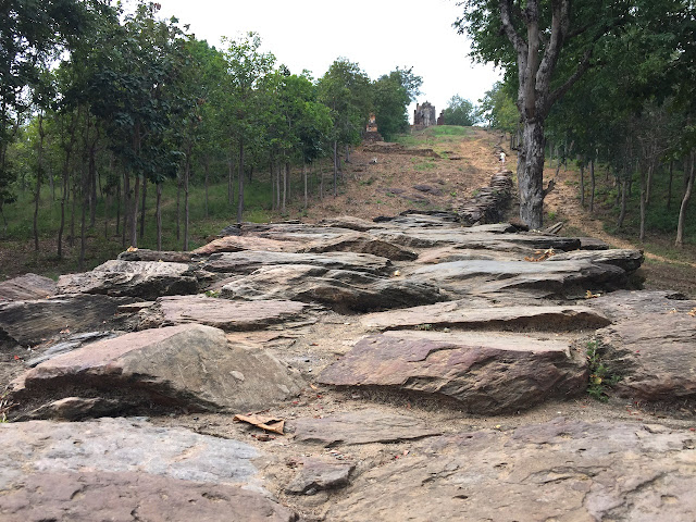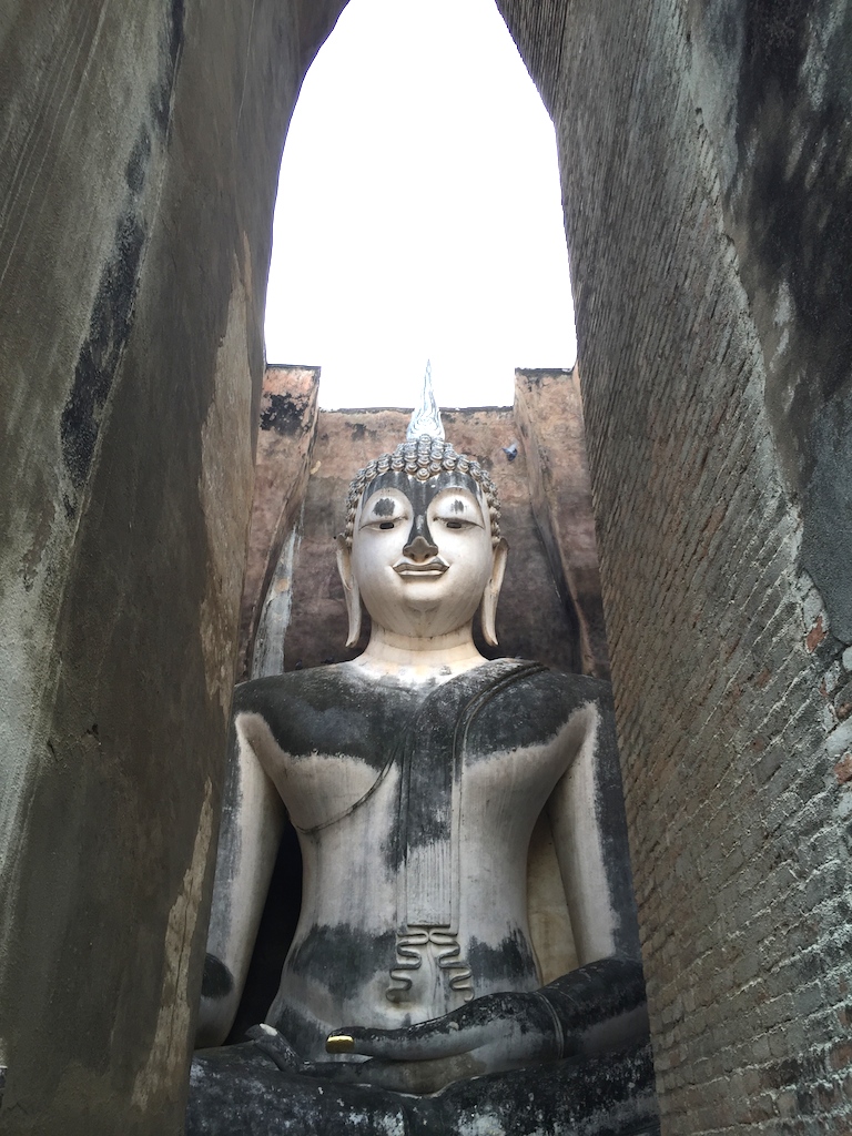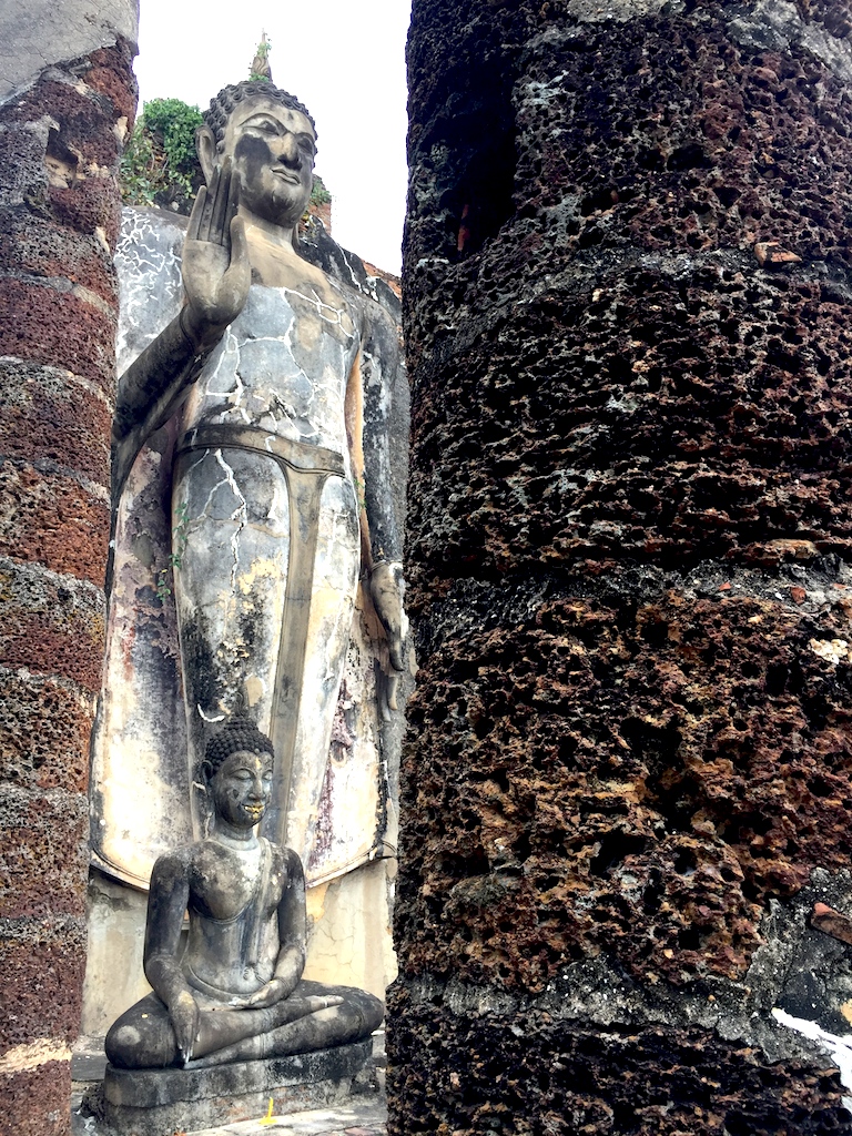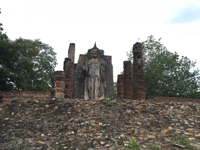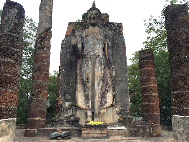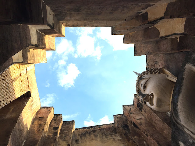 徒步攀登200多級,以石板鋪成的台階,造訪隱藏林間的佛寺,即Wat Saphan Hin,位於城西郊外。在素可泰古蹟園區,勢必要開車、騎車、或騎車,才能逐一探索園區內的寺廟。Wat Saphan Hin在小山丘上,一尊 12米高的站立佛像,色彩斑駁,右手舉起來掌朝外的姿態,據說有保護的含意。這裡非常寧靜,或許不在城內,並不是聚集點。翠綠的叢林,徐風飄逸,如此涼爽。居高臨下,站在這裡,可以鳥瞰整個古蹟園區的景色。這就是第三幕,值得一去的寺廟。