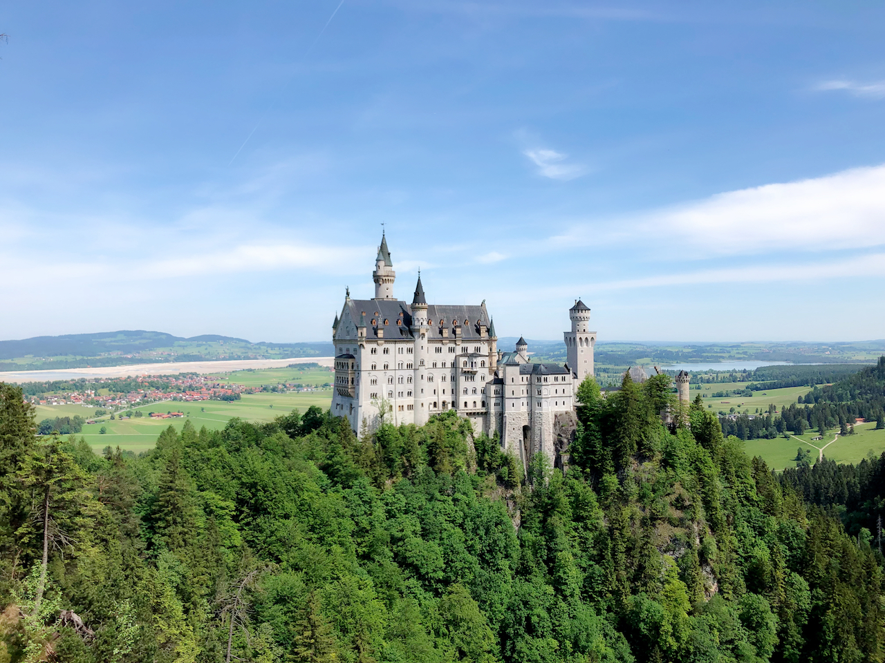 從遠處眺望新天鵝堡,彷佛走進一個童年的夢境。沒有米奇老鼠的城堡,看著新天鵝堡,讓人想著迪士尼。城堡內的格局,國王的精心打造,不僅僅是富麗堂皇,卻看得出一百三十年前時,出現在城堡內的科技。春夏之季,登山訪城堡,走在綠意盎然的叢林。有別於秋冬的蕭瑟與雪景,依舊是國內外受歡迎的景點。照片上不同角度,源自不同區/點而拍攝出來的效果。瑪莉安橋,是其中最佳欣賞及拍新天鵝堡的地點,登山也安全的路線。 高山俯瞰,也可一覽無遺德國阿爾卑斯境內景致的田園風光。到德國慕尼黑,別忘了這座浪漫主義的城堡,位於近郊富森鎮附近。