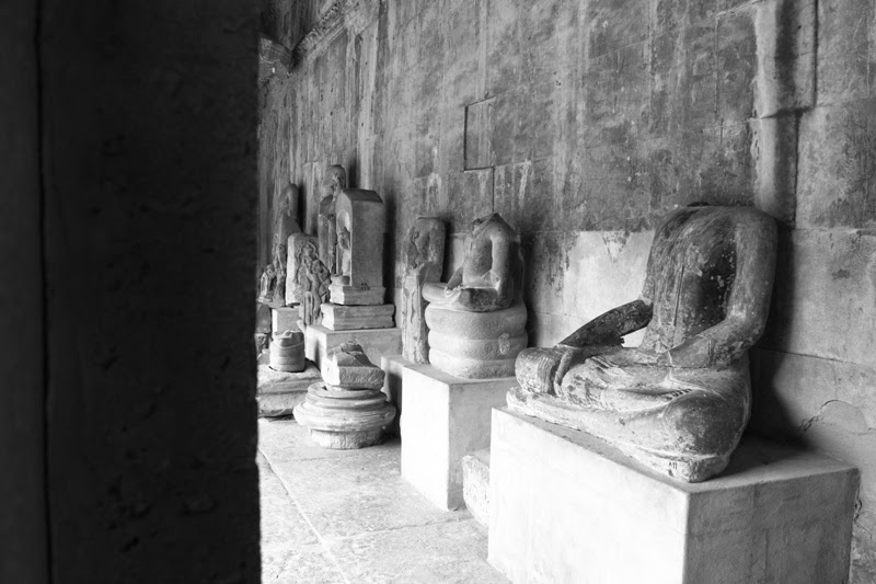 僥倖天氣不是惡劣弄人,否則失望無奈。瞬間天空亮了起來,熊熊烈火的太陽從這座美麗的吳哥窟後方,緩緩升起。幸運的是,這個科技的時代可以記錄。整場,照相機快門的咔嚓聲不停地響。坐在框框的石窗,欣賞這座奧妙的古典藝術神殿。池里的蓮花,含苞待放,水中倒影著吳哥窟的五座寶塔。凝思與幻想,就像世人對埃及金字塔,產生的迷。許多“為什麼”浮現在腦海裡,更多猜想的畫面,產生好奇。走在長廊、走在畫廊、走在塔內、爬上陡峭台階、在塔頂端、從廊門望出。這是宏偉的建築、今世不可缺席的古跡。雕壯的觀石、完美的雕塑、如此靜謐、如此震撼人心,這是探索吳哥奧迷後的感想。毗濕奴像、多頭蛇那伽、仙女的沙岩浮雕、佛像,在吳哥窟裡,有看不完的雕像。在寺廟內的四面八方,牆壁的浮雕描繪著吳哥王朝、印度教神話的故事如《俱盧之戰》、《天堂與地獄》、《羅摩衍那》,各種圓雕浮雕,雕工精細。