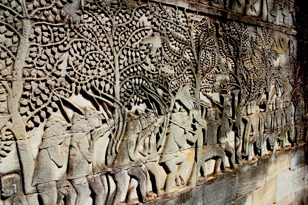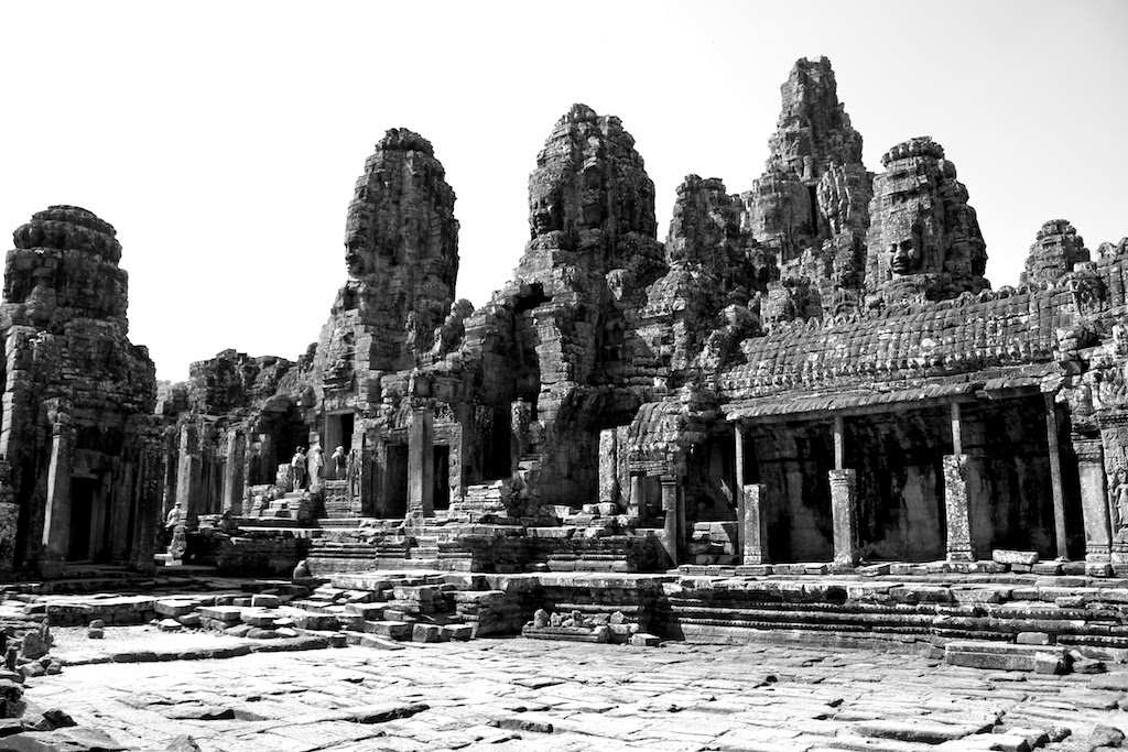 眼前這座雄偉的建築,留給後世著迷。一種神秘感,一種讓人無法對它不戀戀不忘的情懷。佛面塔層層疊疊,當猛烈的陽光,照射那佈滿青苔佛面,可以看見一朵朵的微笑漫開在天際。高棉的微笑,從這座寺看得到,如此燦爛,如此神秘。當風光落幕,歷史也在乎。穿行在佛塔間,四面八方的浮雕皆有四面佛,無論你望那一邊,仿佛這些浮雕的佛臉,帶著微笑的眼睛注視著你,這就是巴戎寺(Bayon)。