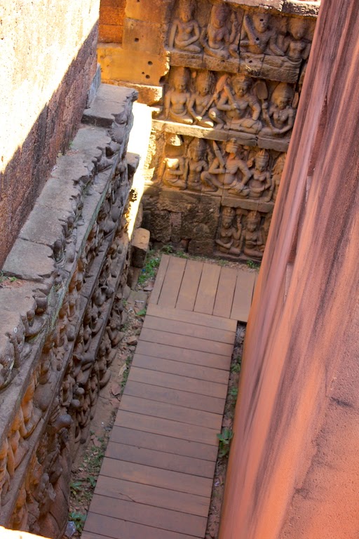 不停地走,從巴戎寺開始,一座座的古蹟排成一列,如此壯觀。接著是空中宮殿,初為真臘國王羅因陀羅跋摩二世(Rājendravarman II )在位時(941年—968年)在興建王宮的同時,建造的濕婆廟,後為蘇利耶跋摩一世改建成為須彌山式印度教寺廟。空中宮殿的建築形式有點類古代馬雅的金字塔,從四邊的階梯可以爬上定空中的頂部,階梯入口處各有石獅站立。在吳哥,許多寺廟都要攀爬到頂,是會累人的,加上炎熱的天氣。不過,既來之則安之,給自己力量,完成觀賞古蹟的任務。