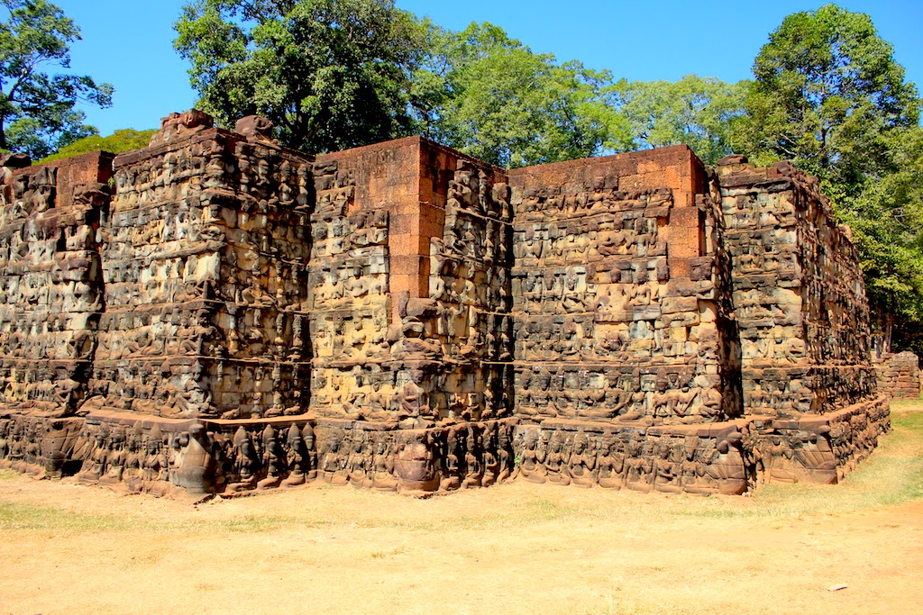 建於12世紀的大象閱兵台(Terrace of the Elepants),屬於百戎寺風格,大約三百公尺長的大象閱兵台在南邊的入口台階處,也有以大象鼻挽住蓮花的三頭大象造型,中間那段的大象閱兵臺則雕滿了獅子與金翅鳥神的浮雕,而在平台的護欄上,則有許多雄獅與蛇神的雕像矗立著。