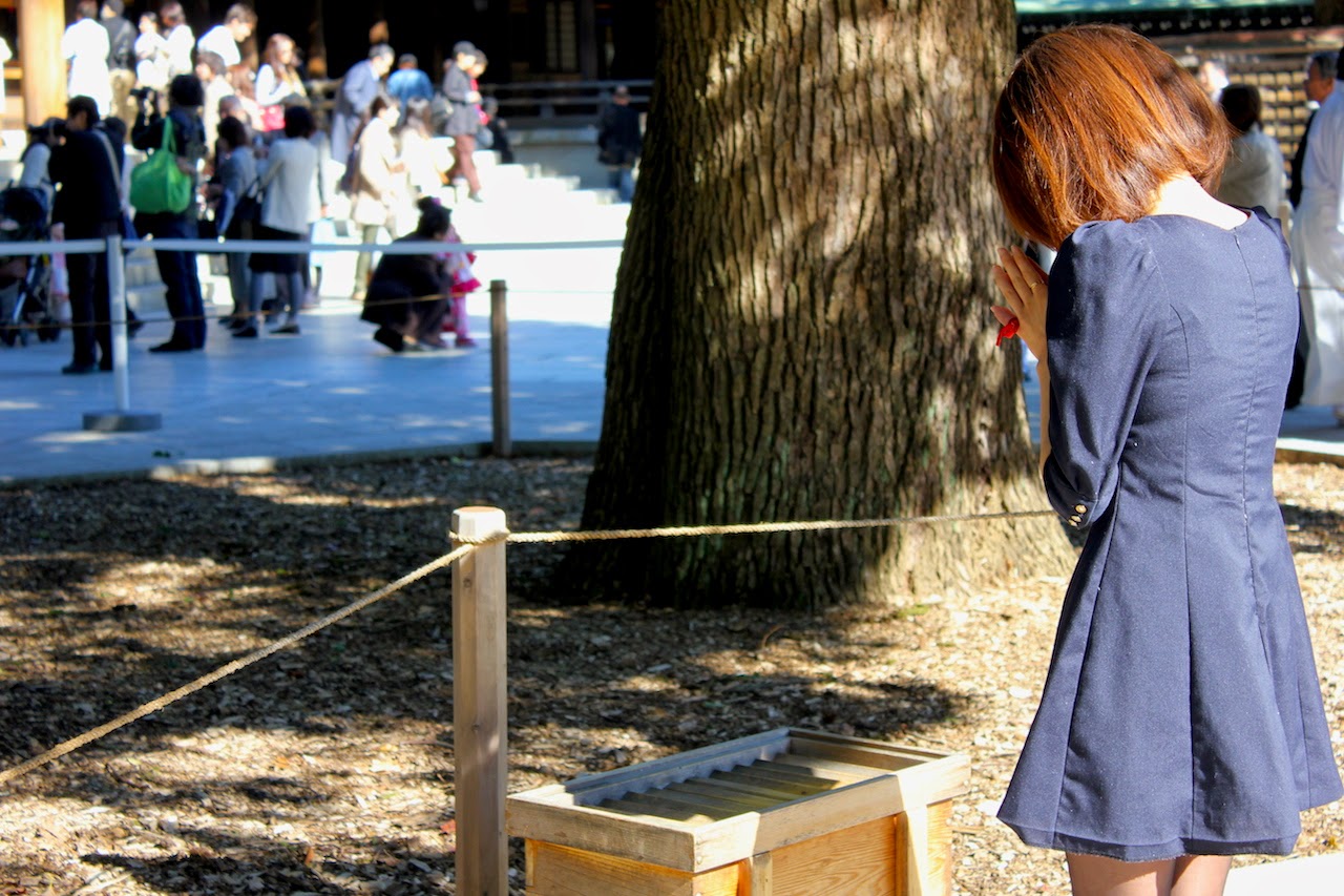 明治神宮,莊嚴肅穆的氛圍。秋天的氣候,加上茂密的叢林,風吹得有點散逸的感覺。除了繪馬,在神宮大殿前,繩子綁住二顆大樹,叫做《夫妻楠》。這是祈求家庭合樂,夫妻圓滿的信仰之一。看見日本美女,站前大樹前,雙手合掌,虔誠的祈禱。木制箱子是《納箱》,如果要捐獻香油錢就投進這個箱子裡。