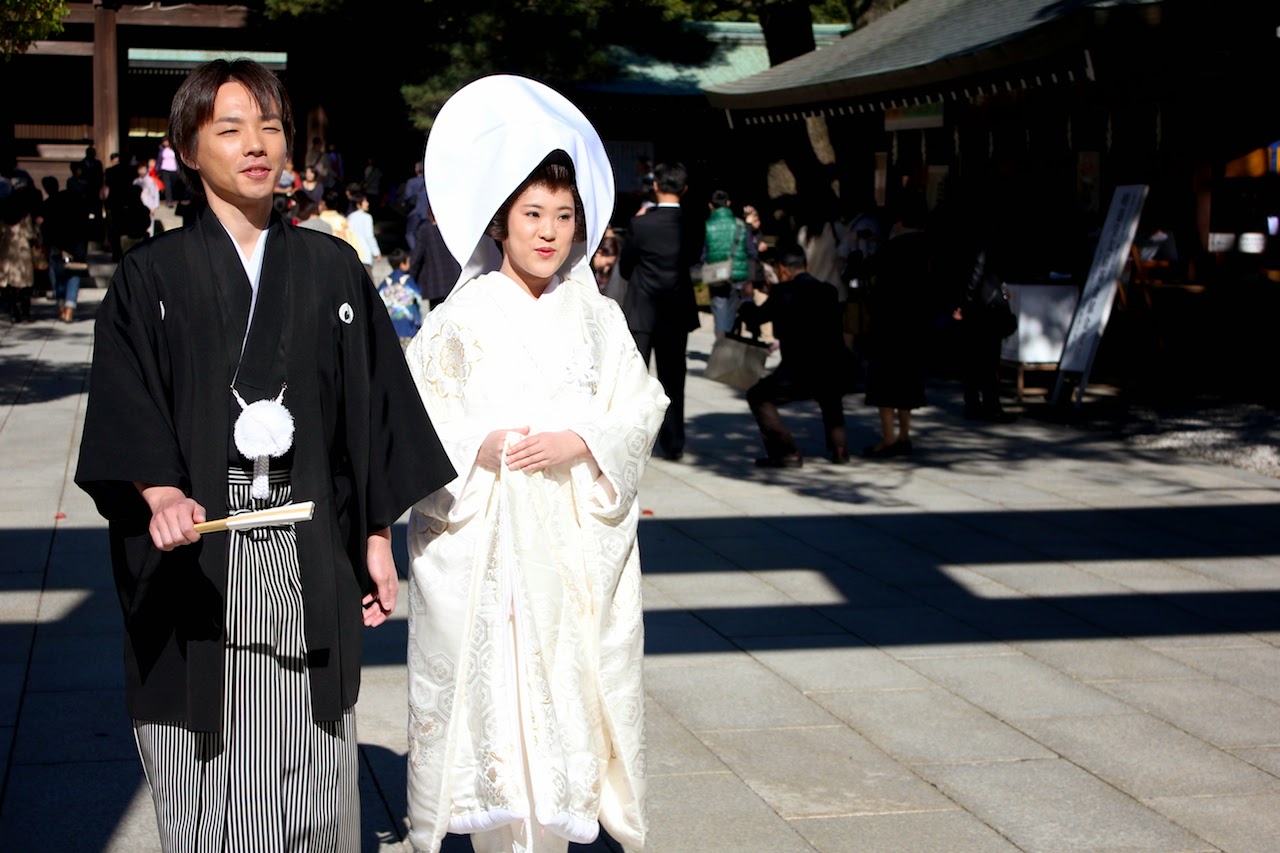 十一月初到日本東京。我來得恰到好處,神宮主殿前,正進行“神前婚”,氣氛莊嚴隆重,一對新人穿著日本傳統禮服(女:白無垢)。並由神官領著,到神殿前舉行結婚祈願儀式。相信,出席著多數為新人雙方親戚出席,真是難得一見的日本傳統結婚進行式,大開眼界,讓人賞心悅目,熱鬧萬分。看見有情人終成眷屬,也是一種欣賞的喜悅。