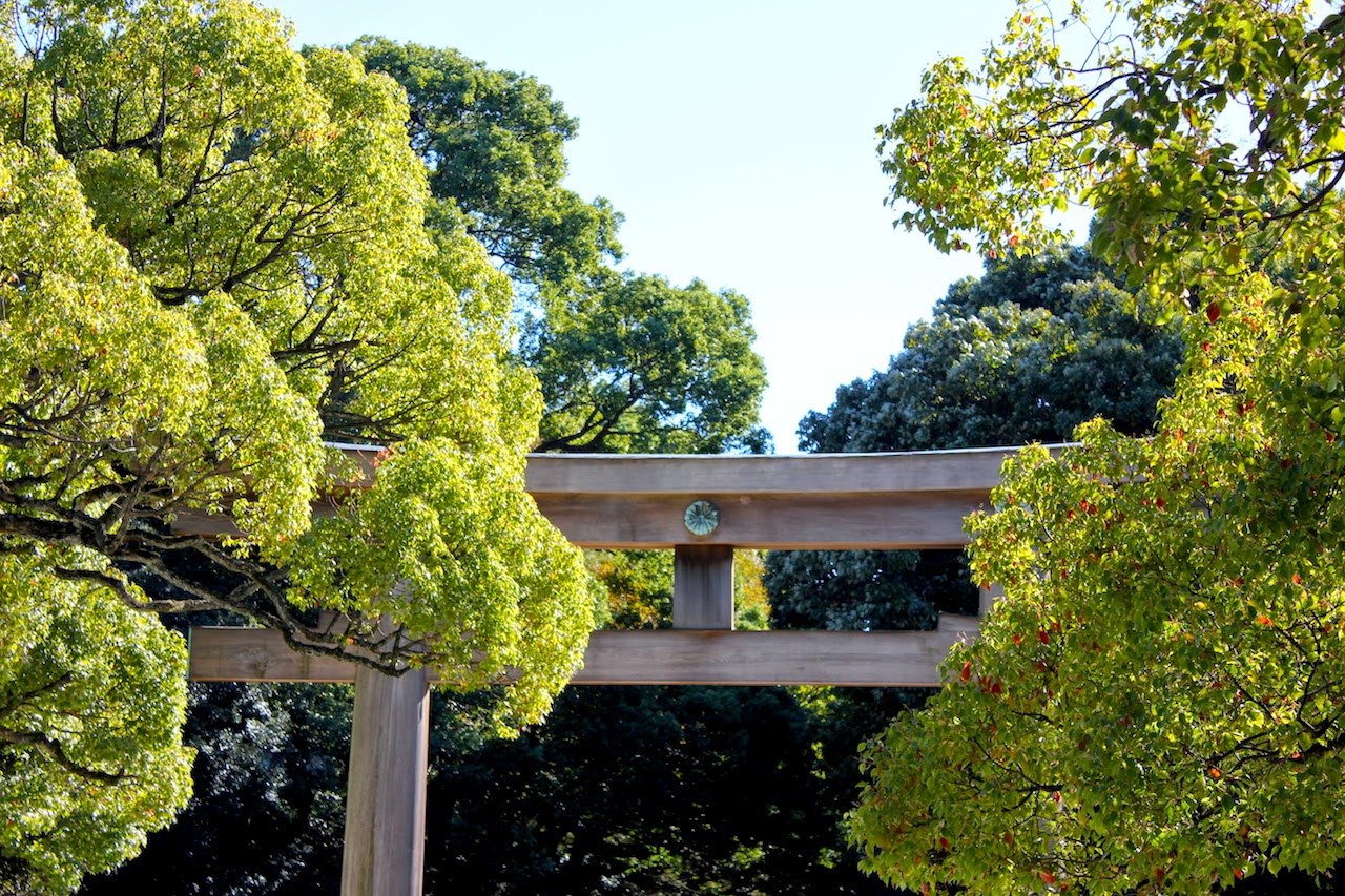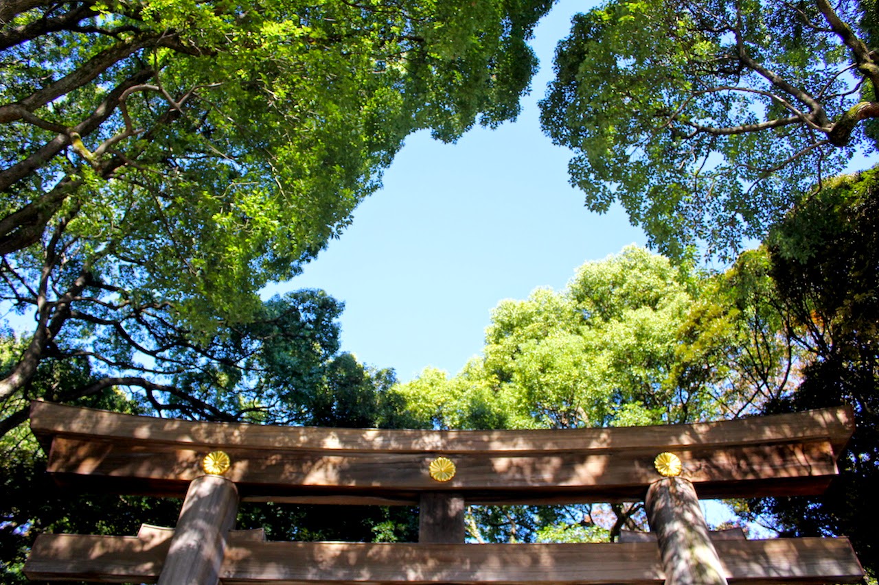 走進明治神宮,起於原宿駅旁的神宮橋,參道交會之處立著日本典型的大鳥居(日式牌樓),日本最大的木製鳥居,形狀如“開”字。又為何稱為“鳥居”呢?日本人認為,鳥類不能接近神社,故在神社正門前設置鳥居,表示讓鳥類在此居住,就不會飛進神社了。原始的鳥居在1966年(昭和41年)因遭雷擊而損壞,現存的鳥居則是在1975年(昭和50年)間向台灣的振昌興業股份有限公司(現林班道商圈)採購丹大山樹齡1500年的扁柏,依照1920年(大正9年)的形制與寸法重建而成。鳥居上的菊花紋章,是日本皇室家徽,即十六瓣八重表菊纹。