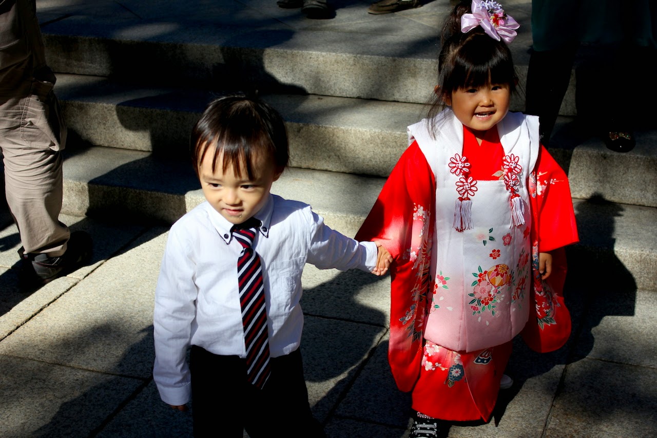 在神宮內,讓我愛不釋手的是,許多盛裝打扮的孩童們。男的英姿十足;女的可愛無比。一下子忍不住,就接近他們,很光明正大的向他們照相。日本的爸爸媽媽都是師哥美女,那是當天遇見的,如此吸引人目光,孩子也不例外,有種“目不轉睛”的心情,好可愛!每年的11月15日,五歲的男孩,七歲與三歲的女孩,都要被隆重打扮,穿上傳統的服飾,前往神宮謝恩祈福。