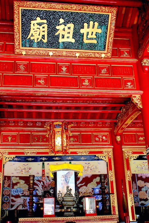 巍峨的午門,厚厚高高的;皇城內的人們,彷彿與世隔絕,像囚鳥,不易飛離。天安門上,掛著毛澤東的肖像;順化皇城過著的是胡志明;兩人乃共產黨的頭號人物。皇宮內的龍,象徵天高皇帝大,至高無上。原來,這裡也有太和殿,想必,當年的皇帝,應該也在這裡見高官,處理國家大事。皇城內的牌坊,具有中國風格,刻有中國文字。
