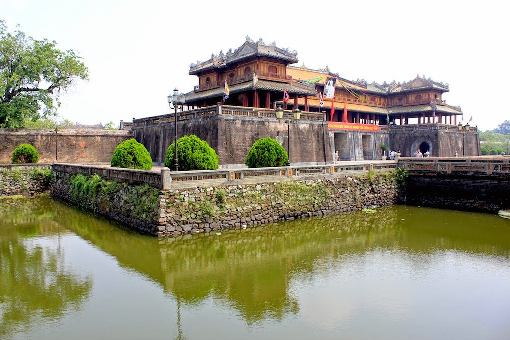 踏過北京紫禁城,再到順化皇城,兩座神秘的面紗,如此震撼,建築巧奪天工。後者參考了北京紫禁城的藍本,從午門,主殿,后妃各宮,長廊,祖廟,宮門等,概念完全相同。惟前者“朱紅”城牆,後者乃“灰與黃”。皇城建在城北,被香江貫穿,於18世紀初葉,阮朝嘉隆帝四年(1805年)開始大規模擴建整修,1821年由明命王完成。順化皇城又稱為“順化故宮”或“紫禁城”,規模是北京紫禁城的 1/7,富麗堂皇的程度遙不可及。