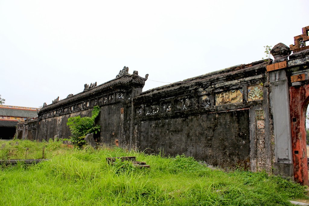 時光倒流,皇宮怎麼讓人有點“淒淒涼涼淒淒”的感覺?我想,徘徊在長廊,總能讓人思索;這也是皇城內的皇子皇女,宮女太監邂逅的地方。通往各宮殿的門,都雕塑栩栩如生的陶瓷,精緻優美。景德崇圣殿乃供奉中國歷代皇帝靈位;越南阮朝的皇帝,靈位就會供奉在世祖廟,歷代皇帝共有十三位。在城內,有一座最高的建築叫顯臨閣,前擺放的青銅九鼎,各刻有古代象徵的動物及植物,內容抽象,各有含義。別懷疑,皇城內一片荒野,卻是戰後留下的殘骸,入目不堪,這是殘暴人類的所作所為,沒有文明,只懂得削薄搶奪他人的土地,最終烽火連篇。