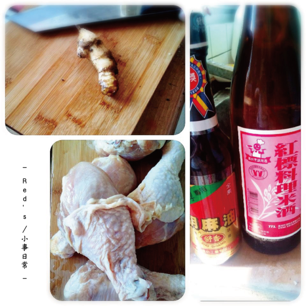 》材料(3~4人):雞腿五隻,薑一大段,麻油,米酒,鹽巴