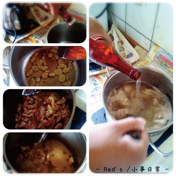 拌炒到雞肉變色後再加入煮沸的熱水跟米酒