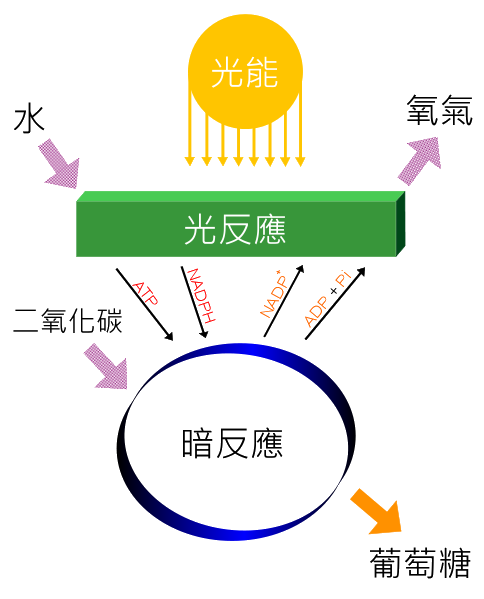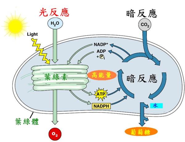 人們把葉綠體比喻是光合作用的廠房,光是動力,水和二氧化碳是原料。原料通過動力在工廠里加工後,產出以糖為主的有機物和氧氣。