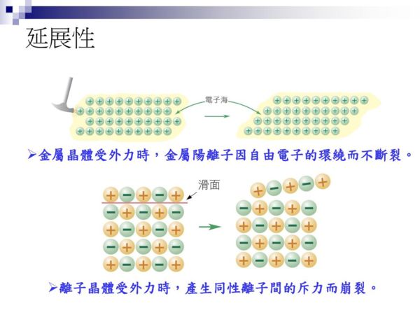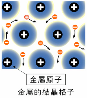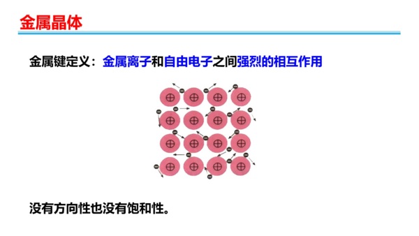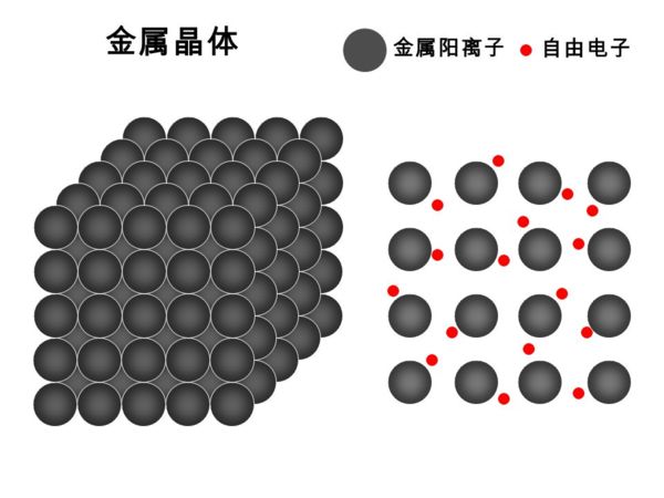 金屬晶體都是金屬單質,構成金屬晶體的微粒是金屬陽離子和自由電子(也就是金屬的價電子)。 在金屬晶體中,金屬原子以金屬鍵相結合。從價鍵法的角度看,在金屬晶體中,金屬原子的價電子不會只與鄰近的某一金屬原子以共價鍵結合(也沒有這麼多價電子與所有的鄰近金屬原子形成共價鍵),而是金屬原子以其價電子公共化。金屬一層一層堆疊,形成許多自由電子,成為電子海,容易導電。 晶格結點上排列金屬原子-離子時所構成的晶體。金屬中的原子-離子按金屬鍵結合,因此金屬晶體通常具有很高的導電性和導熱性、很好的可塑性和機械強度,對光的反射係數大,呈現金屬光澤。 自由電子在整個晶體中自由運動,金屬具有共同的特性,如金屬有光澤、不透明,是熱和電的良導體,有良好的延展性和機械強度。