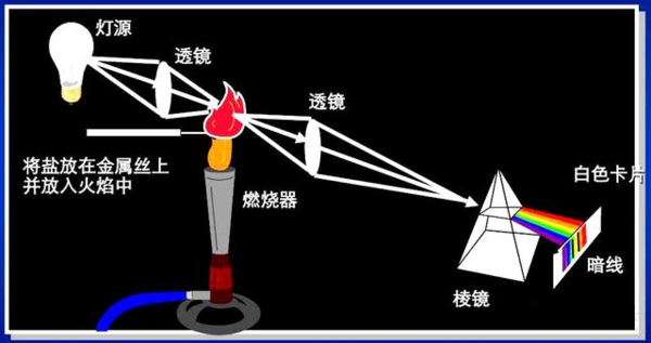 德國的化學家本 生髮現各種金屬及其鹽類在火焰中呈現特有的顏色。以後,他又 與德國物理學家基爾霍夫密切合作,發現金屬及其鹽類的火焰光 透過三棱鏡後被分成若干條不同顏色的線。