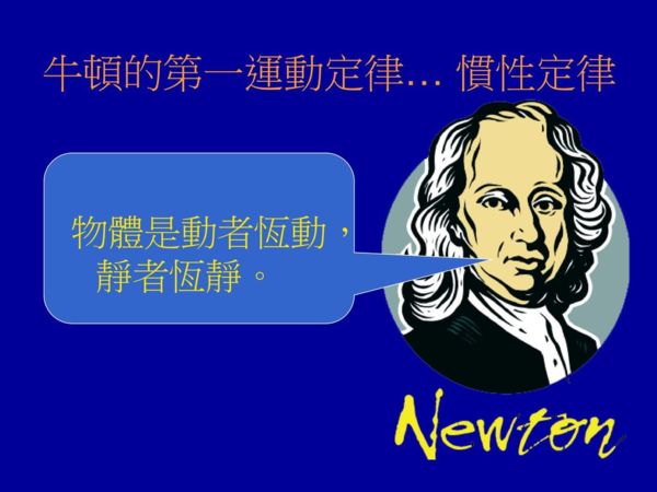 牛頓第一運動定律的意義,每個物體會持續其原先靜止或均勻筆直向前運動的狀態,除非因為受到力的作用而被迫改變其狀態。