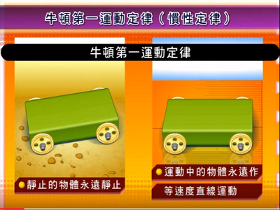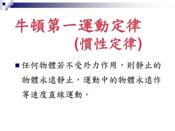 第一運動定律:「物體如果沒有受到外力,其速度的大小與方向就不會改變(物體靜止的時候即是速度為零的狀態)。」