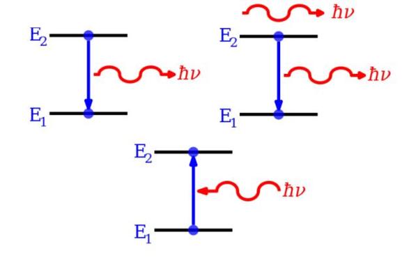 激發狀態的 原子 在 電磁場 真空 (電磁場中一個 光子 也沒有的狀態)的作用下仍能躍遷到較低能級,同時放出一個光子,這稱為自發躍遷或 自發輻射 。