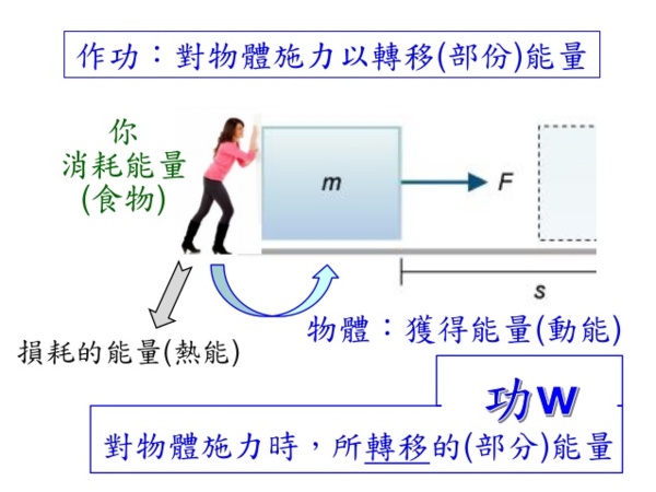 人體對物體施力使物體產生位移,這是必須消耗能量的,但以「能量守恆」的觀點來看,人體消耗的能量不會無故消失,而是以其他形式的能量相互轉換罷了。