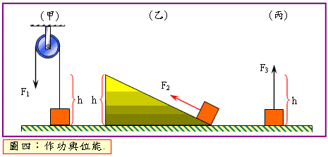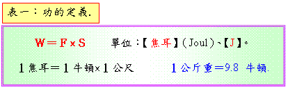 外力對物體作功=F×S,事實上是人體或一具有能量的系統輸出能量給物體的過程,而物體獲得這些能量後會轉變成動能或位能的形式,這便是「功」的本質。