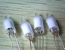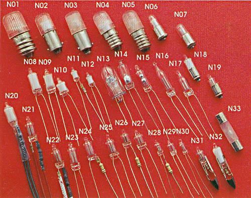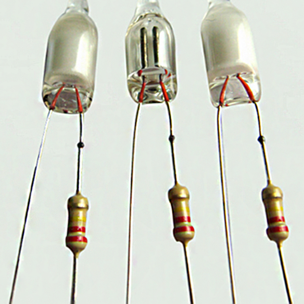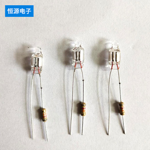 小型氖燈啟動電壓在65V~70V之間,可用電阻來控制使用電壓,110VAC要接上電阻68KΩ使用,220VAC要接上電阻220KΩ~330KΩ使用,現大部分生產(橘光)與(綠光)為主。