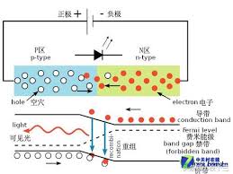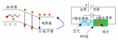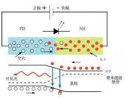 LED 在正向電壓下,電子從電源獲得能量,在電場的驅動下,克服PN 結的電場,由N 區躍遷到P 區,這些電子與P 區的空穴發生複合。由於漂移到P 區的自由電子具有高於P 區價電子的能量,複合時電子回到低能量態,多餘的能量以光子的形式放出。