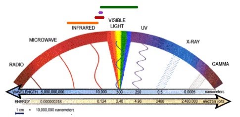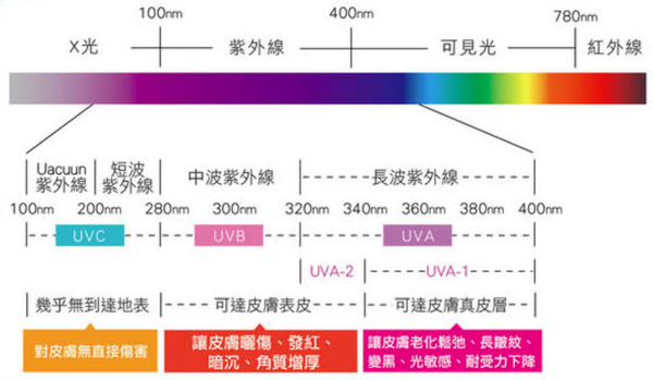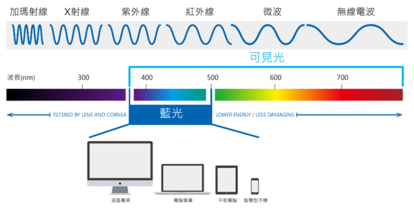 光的粒子稱為光子(photo) ,各光子所攜帶的能量為量子(quantum) ,光能是不連續的,當波長越長其所含有能量越小,短波所含有的能量較高。紅光的波長約為0.78μm(微米),相當於頻率3.85x1014Hz(赫茲),亦相常於能量1.59eV(電子伏特);紫光的波長約為0.38μm,相當於頻率7.89x1014Hz,亦相常於能量3.26eV,所以紅光的波長較長,頻率較低,能量較低;紫光的波長較短,頻率較高,能量較高。顯然光波的波長與頻率成反比;頻率與能量成正比。可見光右邊的電磁波波長比紫光更短(能量更高),依序為紫外光、X射線與γ射線,這些電磁波因為頻率較高(能量較高),對人類都有一定程度的傷害。短波長的 輻射相較於長波長的輻射更容易對人體組織造成傷害。人體常見的病變,如皮膚 癌、瞼裂斑、角膜炎、白內障和與年齡有相關的黃斑等問題,都是暴露在短波長、 高能量的紫外線輻射所造成的。