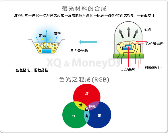 市場最主流的螢光粉是 YAG 釔鋁石榴石螢光粉、硅酸鹽螢光粉、氮化物螢光粉,與藍光 LED。
