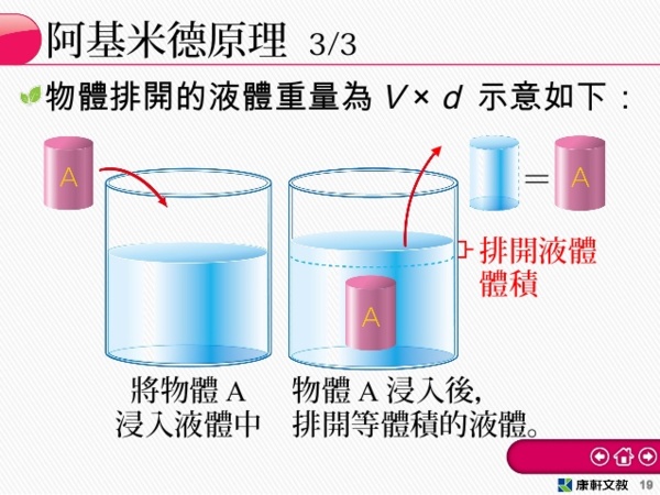 阿基米德發現的原理。流體靜力學的一個重要原理,它指出,浸入靜止流體中的物體受到一個浮力,其大小等於該物體所排開的流體重量。