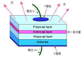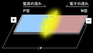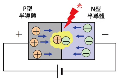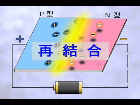 加入順向電壓於此半導體後,電子與電洞將移動、於接合部再結合,此一再結合能量變成光並放出。