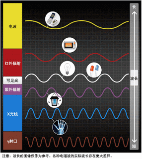 光波長與能量光是稱為「電磁輻射」(electromagnetic radiation)的一種能量形態。光以波傳。 波長長短,從長波開始,電磁波可以分類為無線電波、微波、紅外線、可見光、紫外線、X射線和伽馬射線等等。電磁波的物理行為與其波長有關。