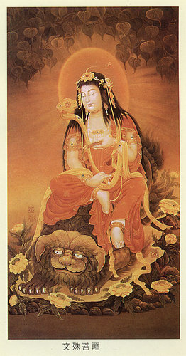 文殊菩薩,身紫金色,形如童子,五髻冠其項,左手持青蓮華,右手執寶劍,常騎獅子出入,既青年,又威猛,卻是無量諸佛母,一切菩薩師。大乘心地觀經言:“文殊師利大聖尊,十方諸佛以為母;一切如來初發心,皆因文殊教化力。”放缽經中,釋尊曾言:“我今得佛,是文殊師利之恩也。過去無央數佛,皆是文殊師利弟子,當來者亦是,其威神力所致。譬如世間小兒有父母,文殊者佛道中父母。”菩薩處胎經文殊身變化品云:“本為能仁師,今乃為弟子,佛道廣大,清淨無增減,我欲現佛身,二尊不並立……”