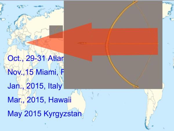 十一月五日週三晚臨行前在亞特蘭大靈糧堂的禱告會,是由剛下飛機遠從NJ飛過來的彭牧師分享了一篇很好的訊息「將來必要成就的事」,內容是鼓舞華人接下最後一棒,要把握機會,將福音傳到地極,最後再傳回耶路撒冷。其中 Power Point 末了的圖片,特別感動我,提醒我們這些寄居美東的客旅,當我們來來回回不知該回到自己的家鄉,還是留在美東的同時,牧師根據掛圖巡迴的地點畫了一張明年「伯特利中心」正在規畫的宣教路線圖,沒料到它正像一支射向靶心的弓箭,已由美東從北到南連成一線,接著往後拉到義大利、再往前射向美西、夏威夷,東馬,新疆咔什再到吉爾吉斯,最後希望能回到以色列(請參閱圖片)這一切就如「箭在弦上,一觸即發」,期待透過華人讓亞伯拉罕的兒子以撒,以實瑪利的後代開始手牽手,互相擁抱,不再針鋒相對……