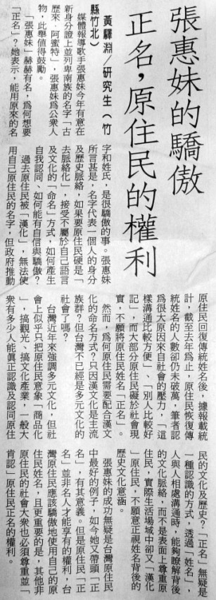 「張惠妹」赫赫有名,為何想要「正名」?她表示,能用原來的名字和姓氏,是很驕傲的事。張惠妹所言甚是,名字代表一個人的身分及歷史脈絡,如果要原住民硬是「去脈絡化」,接受不屬於自己語言及文化的「命名」方式,如何產生自我認同、如何能有自信與驕傲?