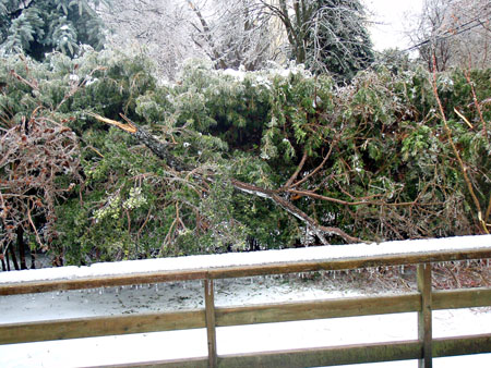 怎知一早起來卻見一片冰封的世界 而且對面老太太的大樹樹幹倒塌在馬路 警察在圍黃封條 想著哇太不可思議了 下樓看到後院的境況才知道情況嚴重