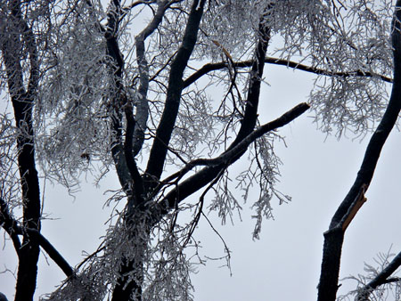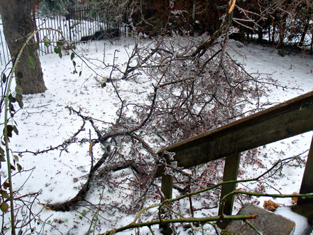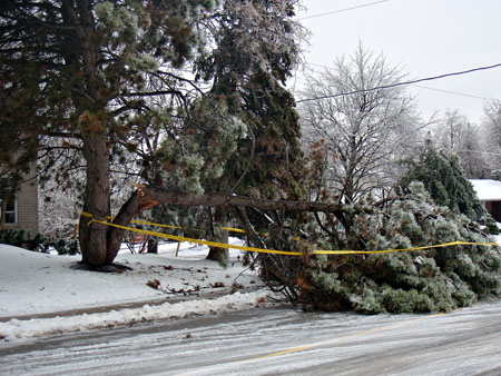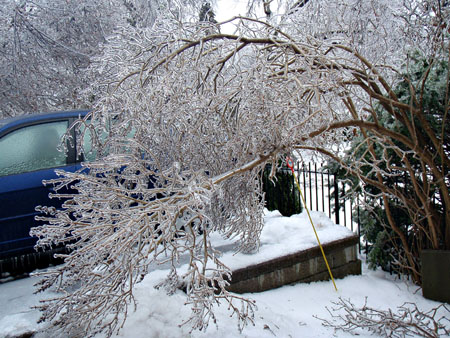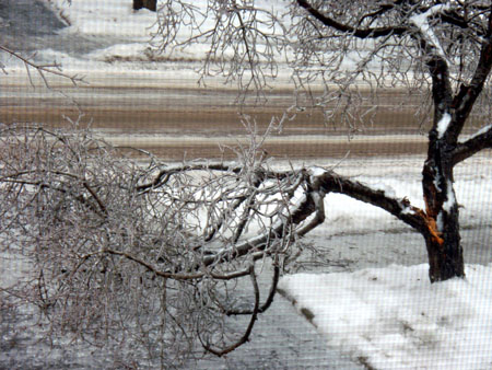 門前凍斷的櫻桃樹直到現在市政府尚未處理 因為是市府的財產所以我們不能自行處理. 這些斷木市府預估要4千萬加幣來清理重種. 唉水電費又要漲