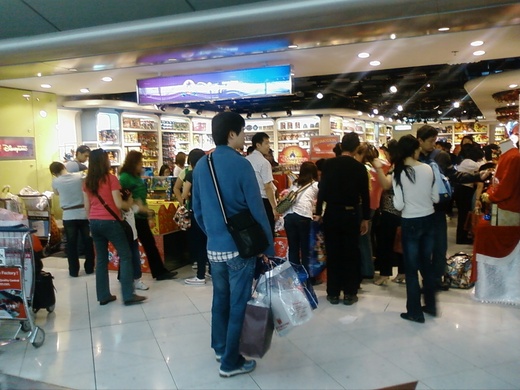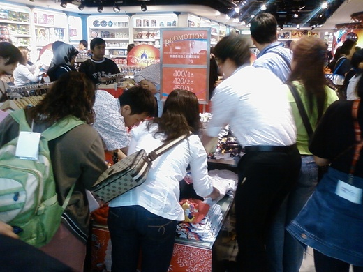 這次(11/27)過境香港,由於早到了一個多小時,就到處溜答溜答,擦身走過兩個小姐,其中一個說”這質量(指品質)很好阿”,引起我的好奇,往前一看,原來是”迪士尼專櫃”,有玩具,紀念衣物(香港有一迪士尼樂園,好像是被台灣反商拒絕後選在香港而修建的。)等商品,而這個小姐所說的是迪士尼專櫃賣的紀念衣物。紀念衣物的質量好不好我沒什麼興趣,由於常出國也沒太大興趣買,但是一堆大陸同胞聚集在一個小專櫃搶購紀念品的景象可就引起我的興趣了。