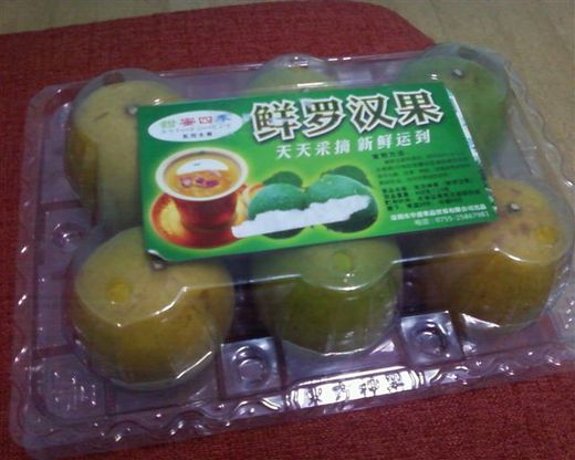 今天去逛COCO PARK的JUSCO,發現一個奇怪水果--羅漢果,以前都是在中藥店看到的乾果,這次是新鮮的。我剝開了一顆嘗了一下,很甜,有特殊香味,但嘗了半顆後舌頭有點麻。。。。會不會中毒了???