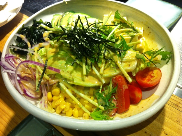 店家親切態度招呼, 讓人感到愉快溫馨, 奉上熱茶後, 為我們點菜, 我們吃燒肉都喜歡先吃點青菜沙拉類, 所以先來這個吧~