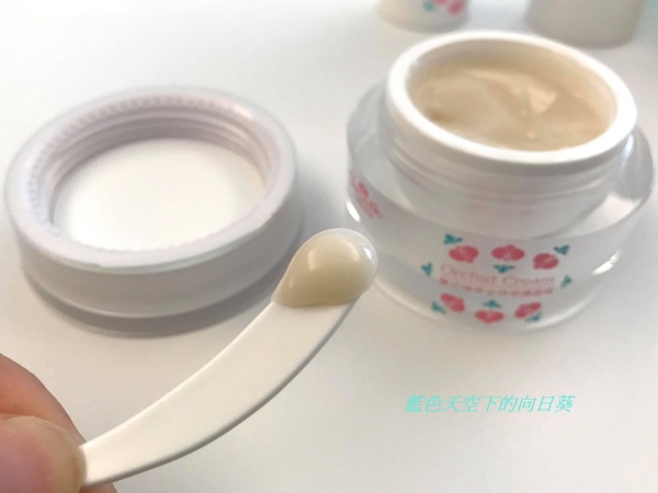 我選用的這款是屬於清爽型修護面霜,結合了精華液與乳霜製成的全效水凝修護霜,顏色為乳白色,也是帶有淡淡的蘭花香味,觸感非常柔滑細緻。