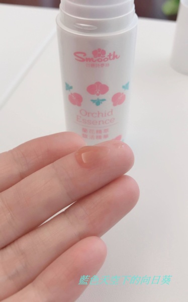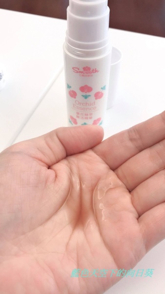 按壓滴了一滴在手指上,棕色的顏色,一樣有股淡淡花香,味道真的很好聞,觸感一樣清爽而且不黏膩,這款是屬於清爽型的精華液,除了清爽型還有滋潤型。