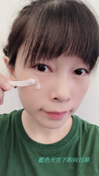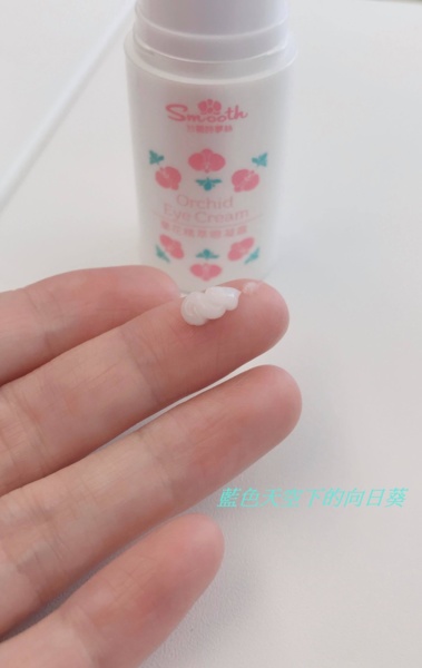 按壓於手指,白色乳狀的眼霜,也是一樣帶有淡淡花香味,眼霜外盒標榜著有膠原蛋白,我塗抹於眼睛周遭肌膚,然後輕輕按摩至吸收,感覺吸收也是很快,而且重點是完全不會有過於滋潤的黏膩感,過去用過很多眼霜都覺得太滋潤黏膩,但是台糖的這款眼霜真的沒有黏膩的感覺,這款眼霜我個人真的很喜歡,讓我的眼睛周圍的肌膚感覺很舒服。