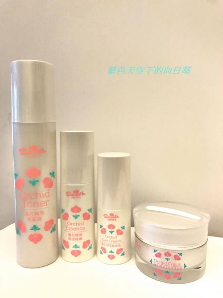 這組保養品從左至右依序為 蘭花精萃奇肌露、蘭花精萃馥活精華、蘭花精萃眼凝霜、蘭花精萃全效修護面霜。