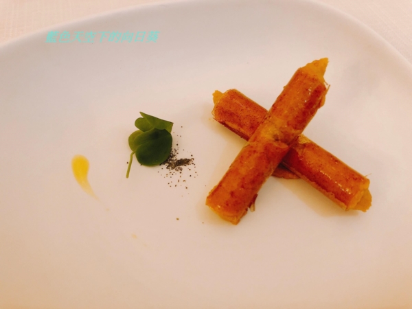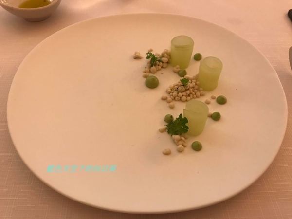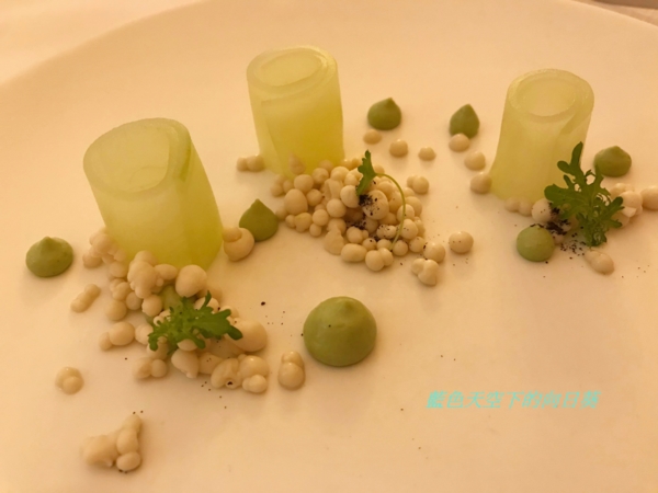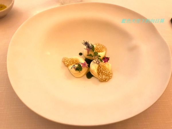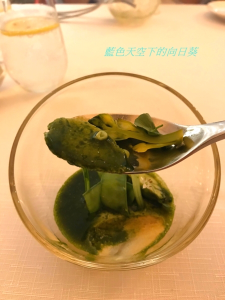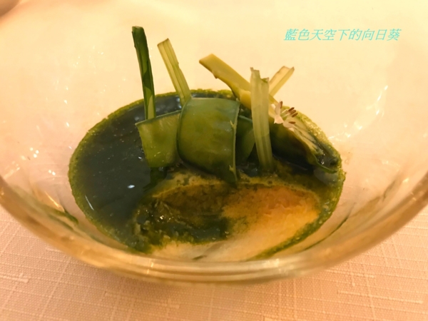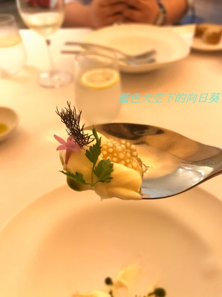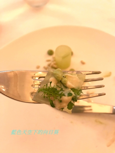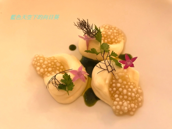 使用鮮蠔熬湯、牛奶、帕瑪森起司加液態氮製成晶球狀的分子料理,黃瓜用米醋與香草真空醃製,黃瓜因為使用米醋醃製,所以味道酸酸甜甜,搭配液態氮製成的生蠔起斯晶球一起吃的口感非常開胃,這樣的口感讓我回味無窮。