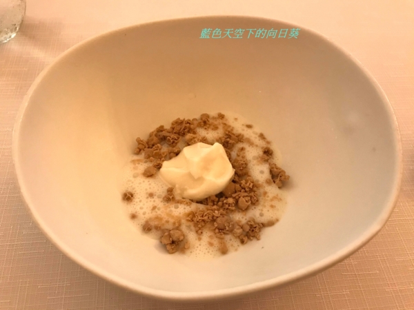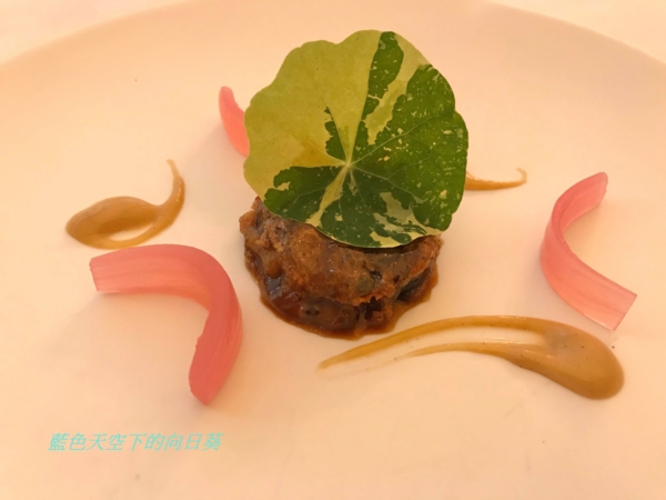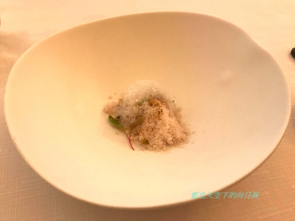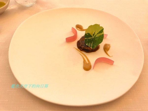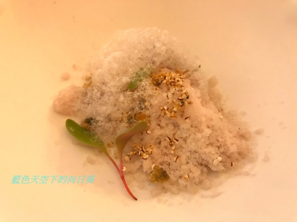 使用海鱸魚打碎,再用液態氮製成如碎冰般的顆粒,搭配下方甜菜梗製成的慕斯,雖然是液態氮製成碎冰,不過仍吃得出鱸魚鮮美的味道,也是一道很特別的料理。