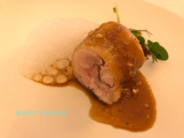 使用嘉義雞肉種,煙燻桃木泡水製成泡泡嚐起來口感酸酸甜甜的,使用半釉汁,搭配白蘭地製成的果凍,用牛肝菌製成的細粉,搭配桂丁雞,嚐起來外皮及肉質鮮嫩可口,帶有濃濃煙熏桃木的香味,桂丁雞果然好美味!