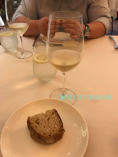 我與先生吃著餐前麵包,喝點白酒,兩人開心暢談,邊等待料理上菜。