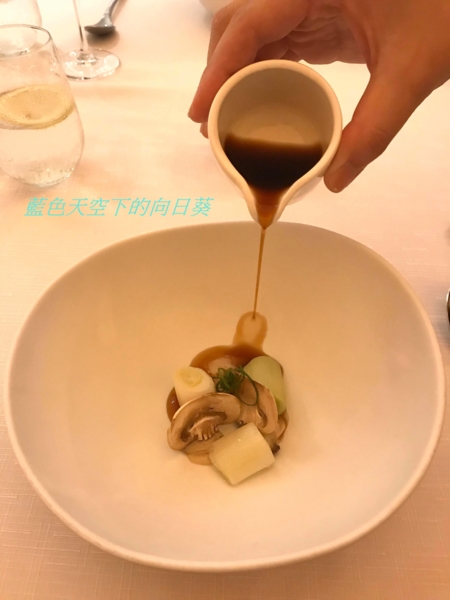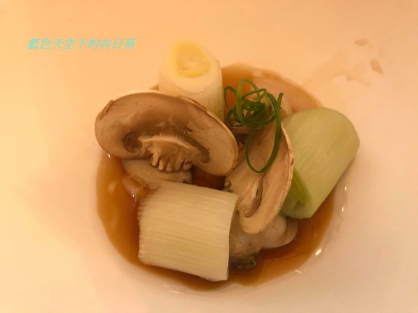 用日本大蔥當主角,大蔥與淡菜烏賊燉煮醬汁,搭配蘑菇片以及宜蘭海鮮竹蛤,味道好清爽。
