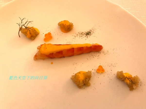 胭脂蝦清蒸,藜麥加味噌烹調,橘色醬汁為海膽醬汁,再放些許鮭魚卵點綴。