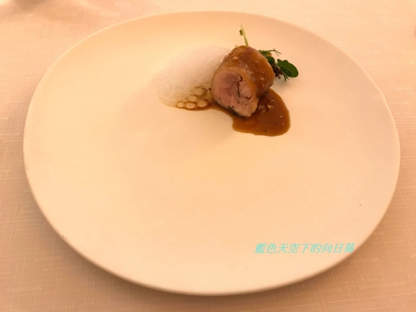 豬腳去骨先燉煮後烤,含豐富膠原蛋白,金蓮花的葉作擺盤裝飾,紅酒醋醃製洋蔥,口感除了Q彈的膠質外,還吃得到如德國豬腳外皮酥脆的口感,搭配醃製洋蔥爽口不膩,令我覺得驚訝,豬腳竟然能烹煮成如此特別的料理。