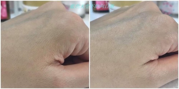照片左邊為使用胎盤原液前的手,右邊是使用胎盤原液後的手,左邊的手可以看出手上較乾燥的紋路,右邊的手使用胎盤原液後看起來感覺比較沒有乾燥的紋路。